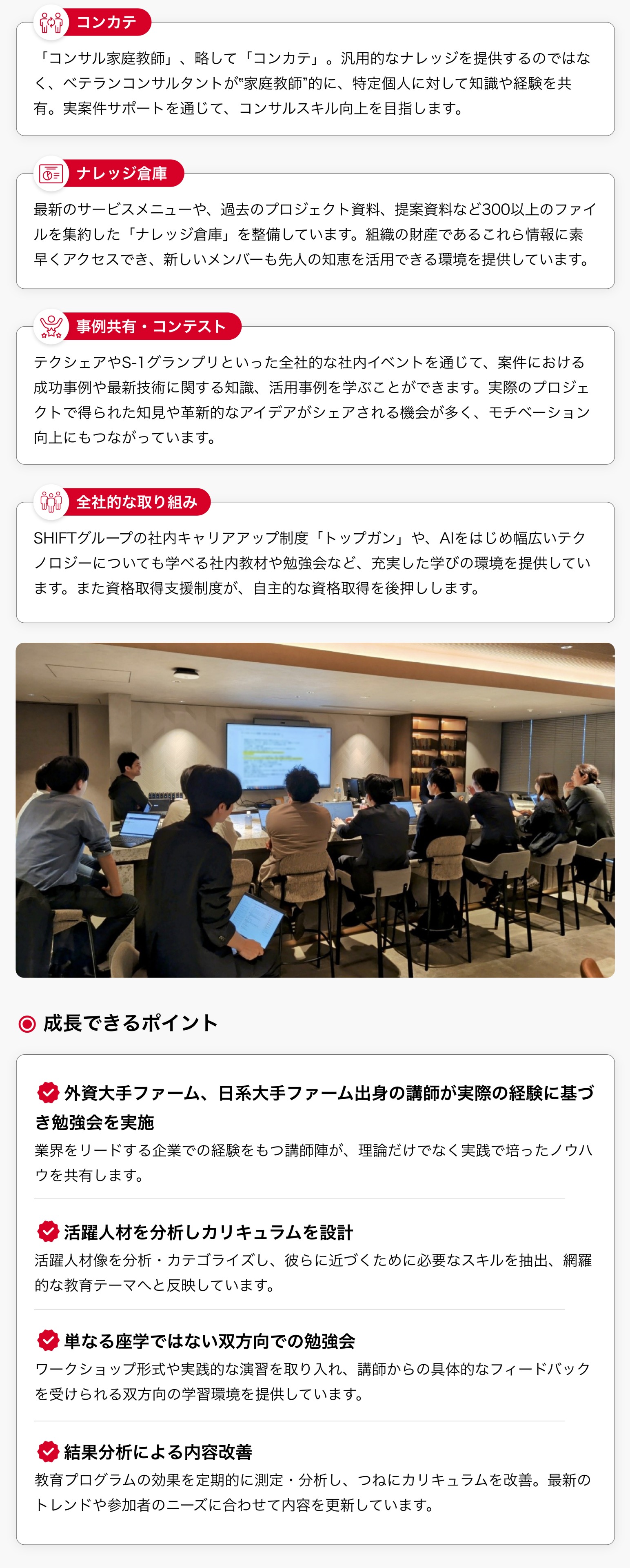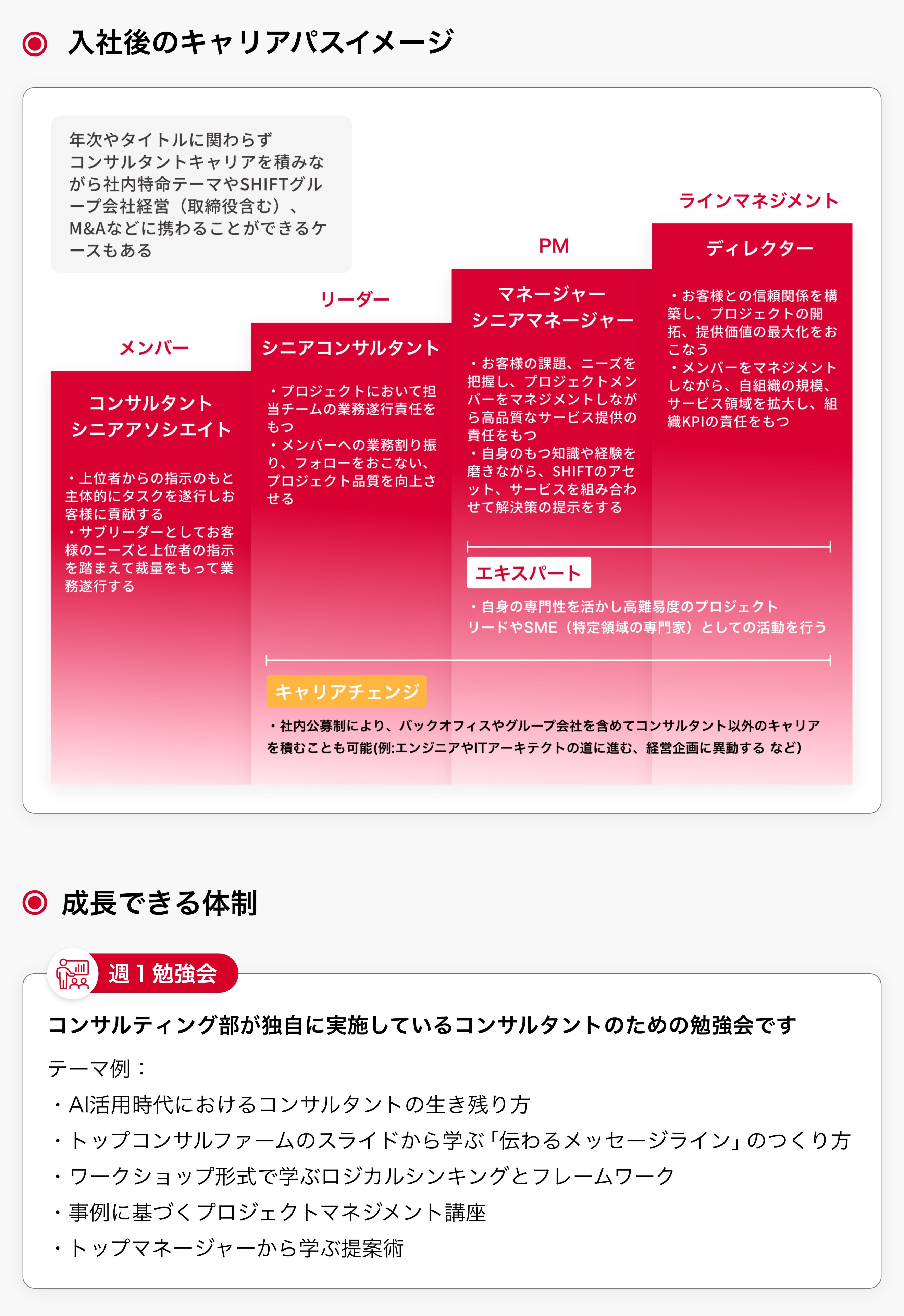 カルチャー コンサルタント SHIFT コンサルティング事業部の教育体制 2025/08/25 SHIFTのコンサルティング事業部の特徴は、入社早々にプロジェクトに入り、「ジャンプスタート」をすることです。私たちが社内教育を通じて目指すのは、単なる知識やスキルの習得にとどまりません。 お客様の真の課題を見抜き、本質的な解決策を提案できる。そんなコンサルタントへの成長を促す、SHIFT独自の教育体制についてご紹介します。 この記事のタグ カルチャー コンサルタント 記事一覧へ