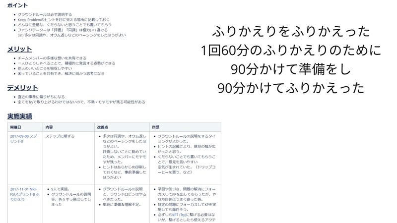 ふりかえり手法も見直して、自分なりのファシリテーション方法を改善しました。1回60分のふりかえりのために90分かけて準備をして、その後90分かけてふりかえりをふりかえりました。