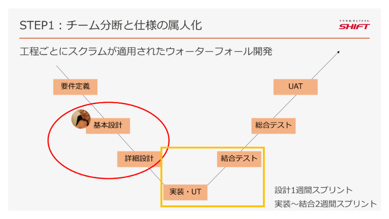 開発手法は、「工程ごとにスクラムを適用したウォーターフォール型」。具体的には、基本設計は1週間ごとのスプリント、詳細設計から結合テストは2週間ごとのスプリントといった形でした。