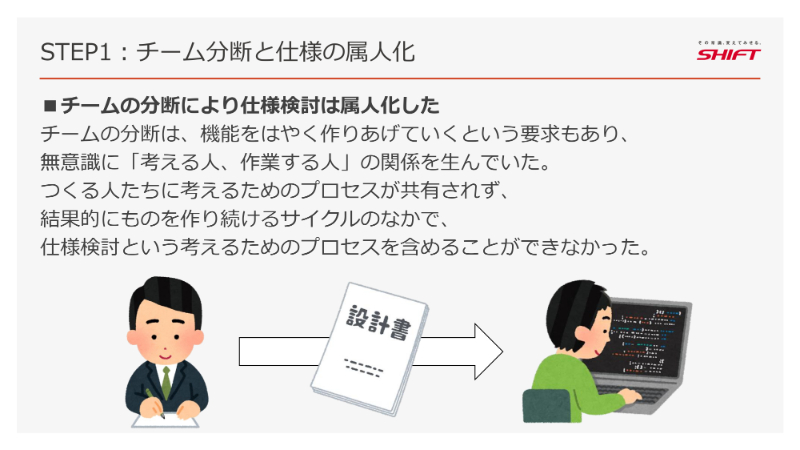 チームの分離は、無意識のうちに「仕様を考える人(設計チーム)」と「コードを書く作業をする人(開発チーム)」という役割の分断を生み出しました。