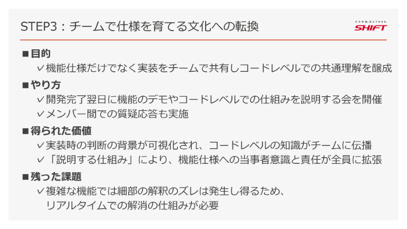 そこで行った3つ目の施策は、機能開発直後の仕様共有会です。これは、各メンバーが担当機能の開発を終えた直後に、その仕様や実装内容をチームに共有する会です。
