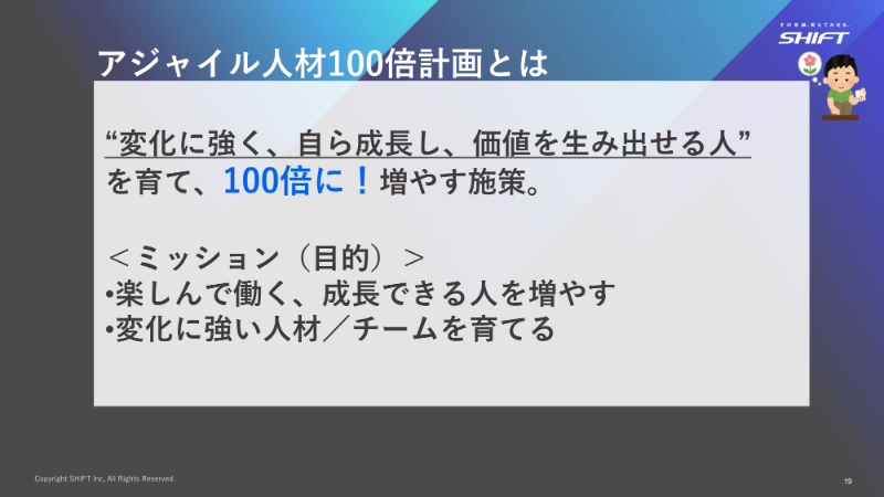 最初のアクションは、組織全体の意識を変えるための土壌づくりです。個人の思いだけで実現することはむずかしいと考え、「アジャイル人材100倍計画」を立ちあげました。
