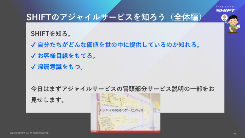 さらに、メンバーがSHIFTという会社をより深く知るための機会も設け、提供しているサービスの価値や意義を共有することで、帰属意識と誇りを高める取り組みも行いました。