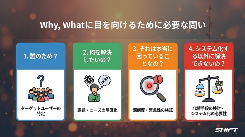AIが得意とするのは「How(どうつくるか)」の実装部分です。対して、人間が担うべき領域は「Why(なぜつくるか)」と「What(何をつくるか)」の定義にシフトしています。