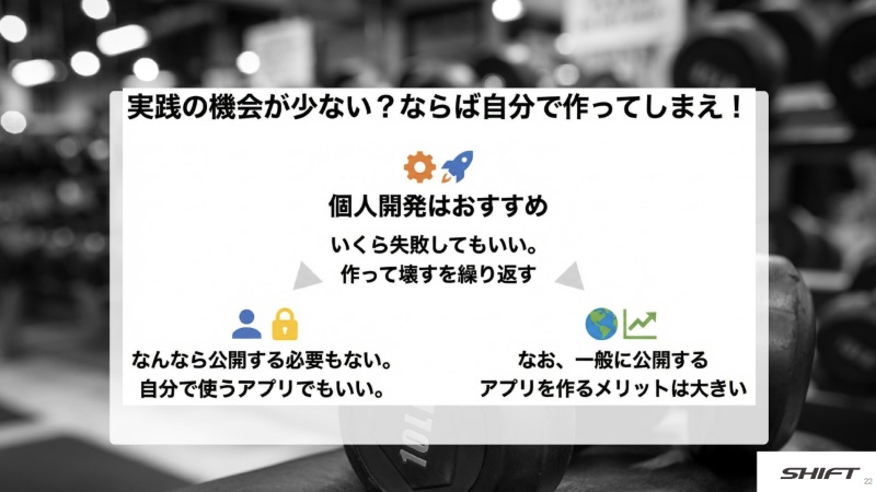 私は「実践機会の創出」を意識的に行ってきましたが、もっとも効果的なのは、業務外で「自分自身でアプリケーションをつくり、公開してみる」ことです。