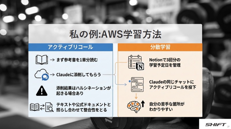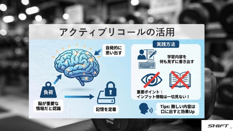エンジニアは学ぶべき技術領域が広いため、効率的なインプットも欠かせません。そこでおすすめなのが「アクティブリコール」です。これは、「学習した内容を、何も見ずに思い出す」勉強法です。