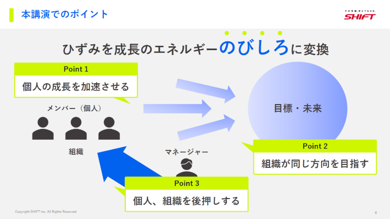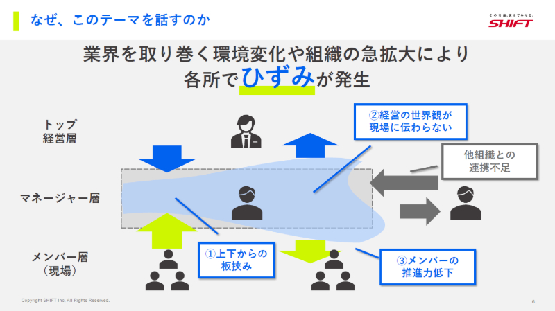 多くの企業では、このひずみを解消すべき問題として捉える傾向にありますが、SHIFTはそれを成長のためののびしろと定義し、組織の駆動力に変えています。