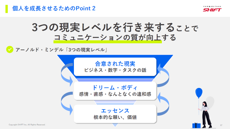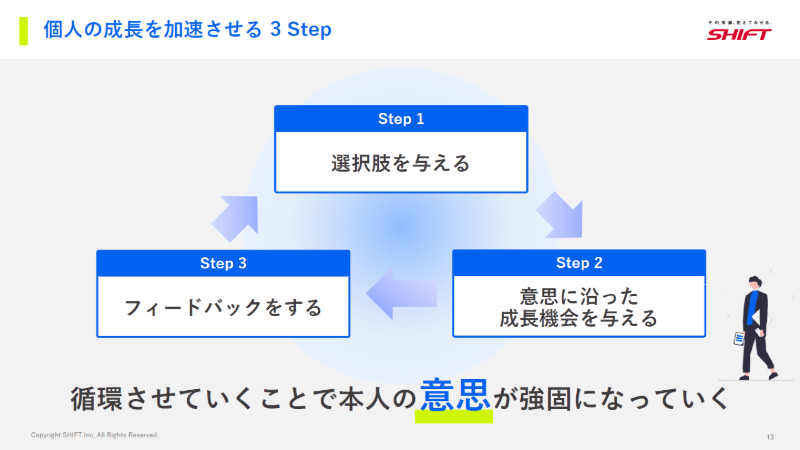 一つ目は、個人の意思を育てること。そのためにSHIFTでは、メンバーに対して「あなたはどうしたいのか」を引き出す問いかけを徹底しています。