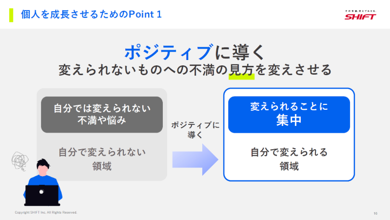 さらに、フィードバックでは「ポジティブな変換」を意識しています。メンバーが抱える悩みの多くは、自分ではコントロールできない環境要因(変えられないもの)に向きがちです。