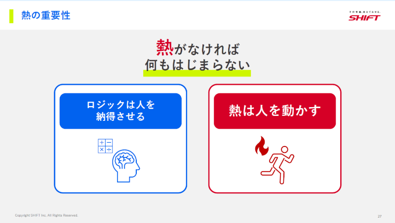 ひずみをエネルギーに変える三つ目のポイントは、「熱量を伝える」。ロジックは人を納得させるための手段であり、人を動かす手段は理屈を超えた「熱量」です。